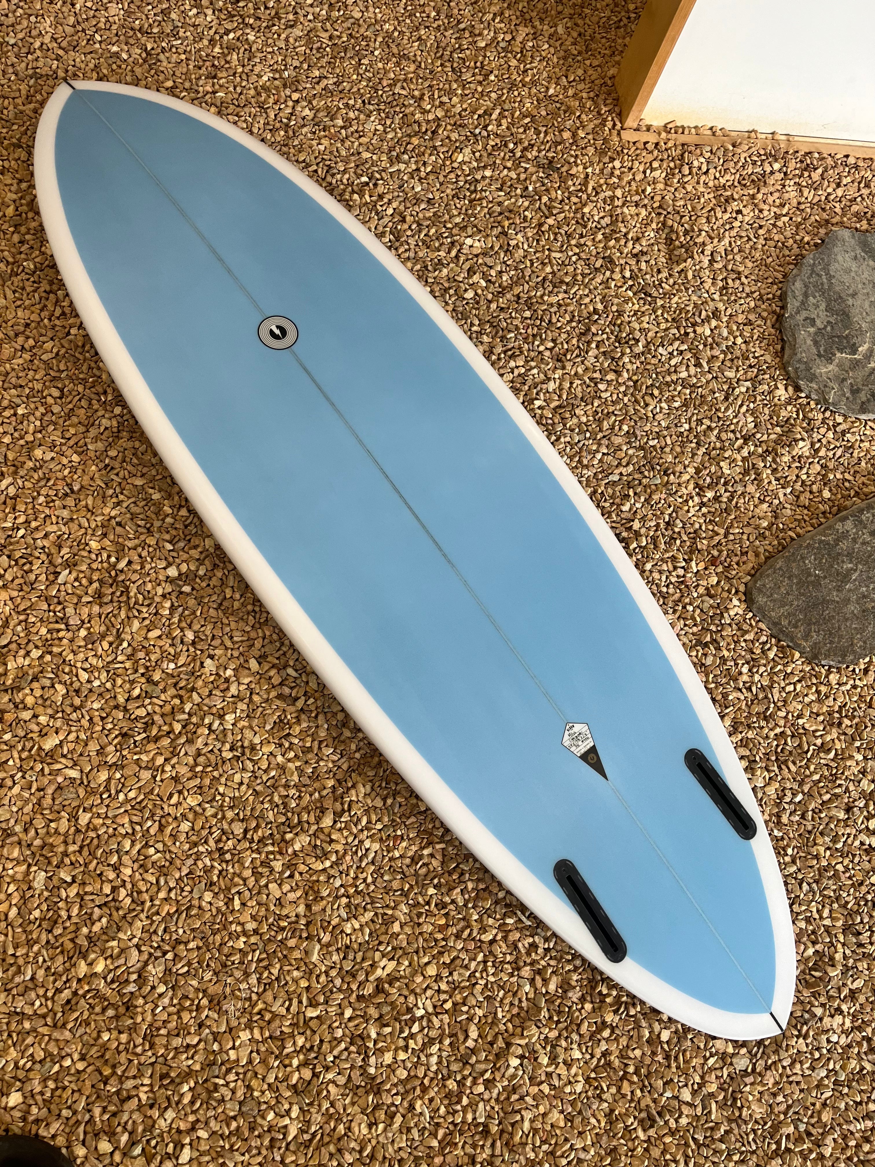 This is Asher and Matt’s next evolution of a fish with a sleeker outline and foil. It has modern elements in a classic and traditionally pleasing platform. A fish that can explore the limits of speed and tube-riding and can be taken above the lip. Primarily a twin fin, but can be tried as a quad or twin with stabiliser. Modern single- to double-concave to vee off the tail, and contemporary rails. Ridden an inch or so longer than a Sunstone and a bit narrower, but the same thickness. Ride it with 2-3 litres more than your performance shortboard.